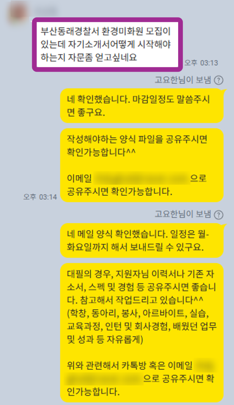 특히, 취업 자기소개서 첨삭 및 대행, 학업계획서, 경력기술서 및 직무수행계획서, 면접 컨설팅까지! 취업의 모든 과정을 함께하고 있어요. 이번 후기는 부산동래경찰서 환경미화 공무직 채용에 도전하신 지원자분의 사례인데, 공공기관 취업을 준비하시는 분들께 정말 좋은 팁이 될 거예요! 😊