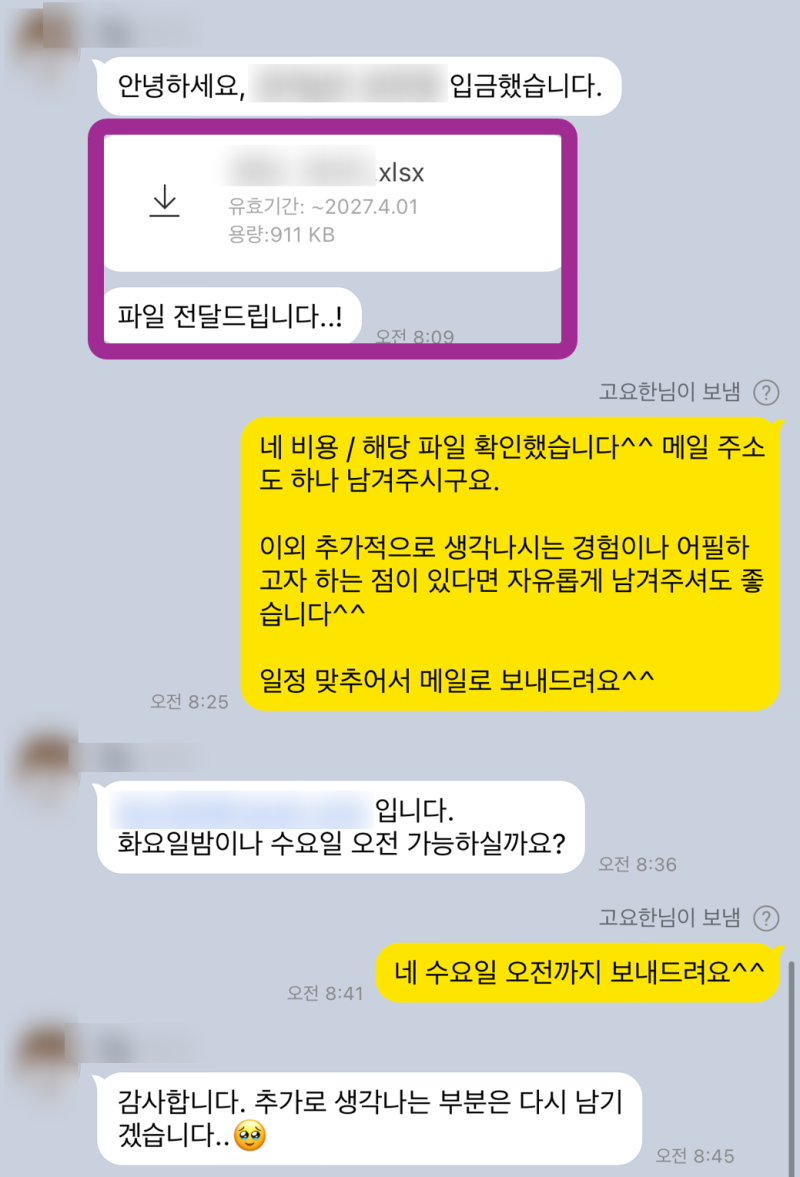 >> 5단계: 1차 결과물 전달 및 피드백 (지원자님과 소통하며 완성도를 높여요!)