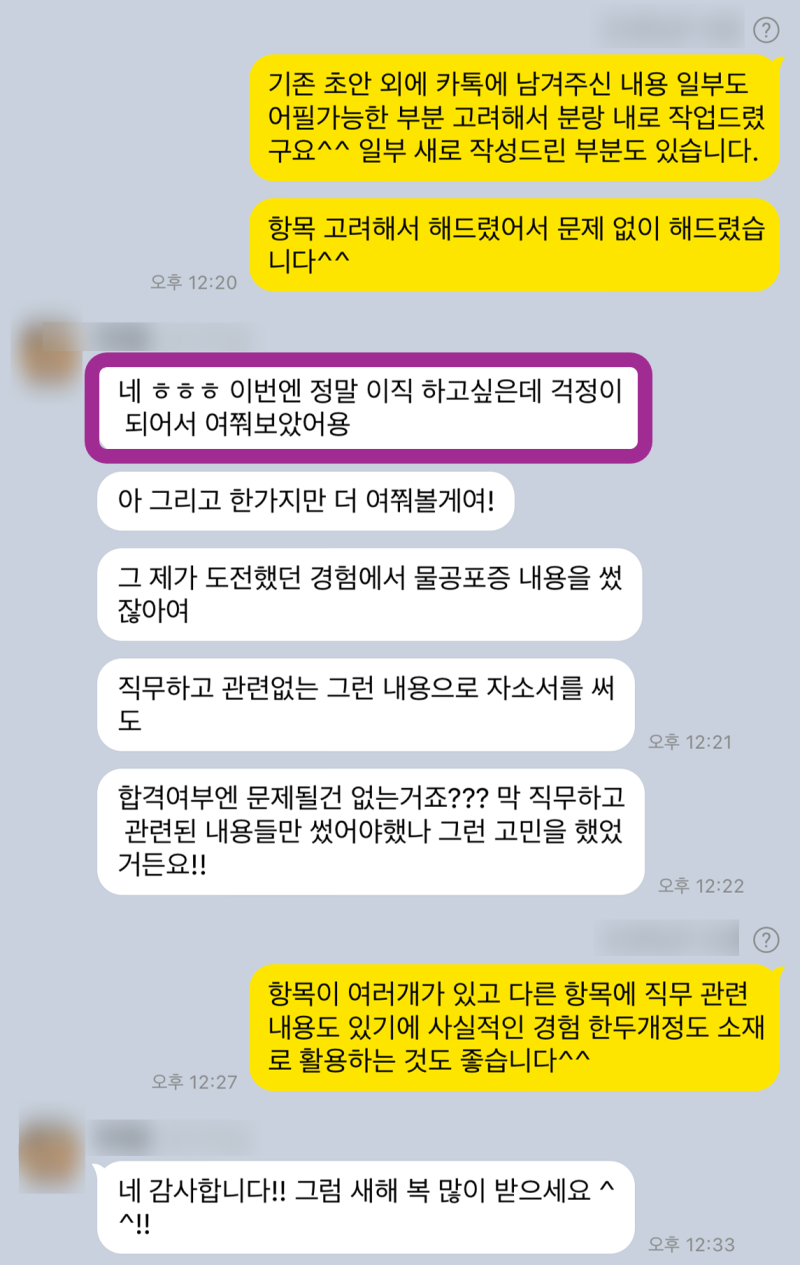 >> 4단계: 첨삭 및 수정: 완성된 스토리를 바탕으로 자기소개서를 첨삭하고 수정합니다. 문장 하나하나, 단어 하나하나 꼼꼼하게 다듬어 최고의 자기소개서를 만들어 드립니다.