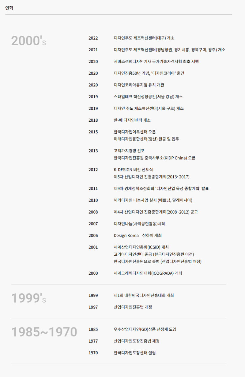 - 주요 사업: K-디자인 어워드, 디자인 주도 기업 혁신 지원, 서비스 디자인 융합 사업, 디자인 인재 육성, 지역 디자인 거점 구축 등