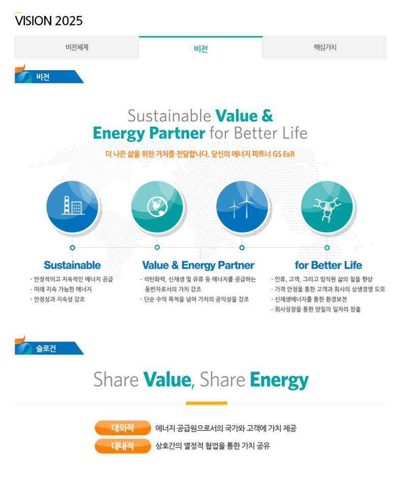 - 비전: 깨끗하고 풍요로운 에너지를 공급하는 종합에너지솔루션 리더